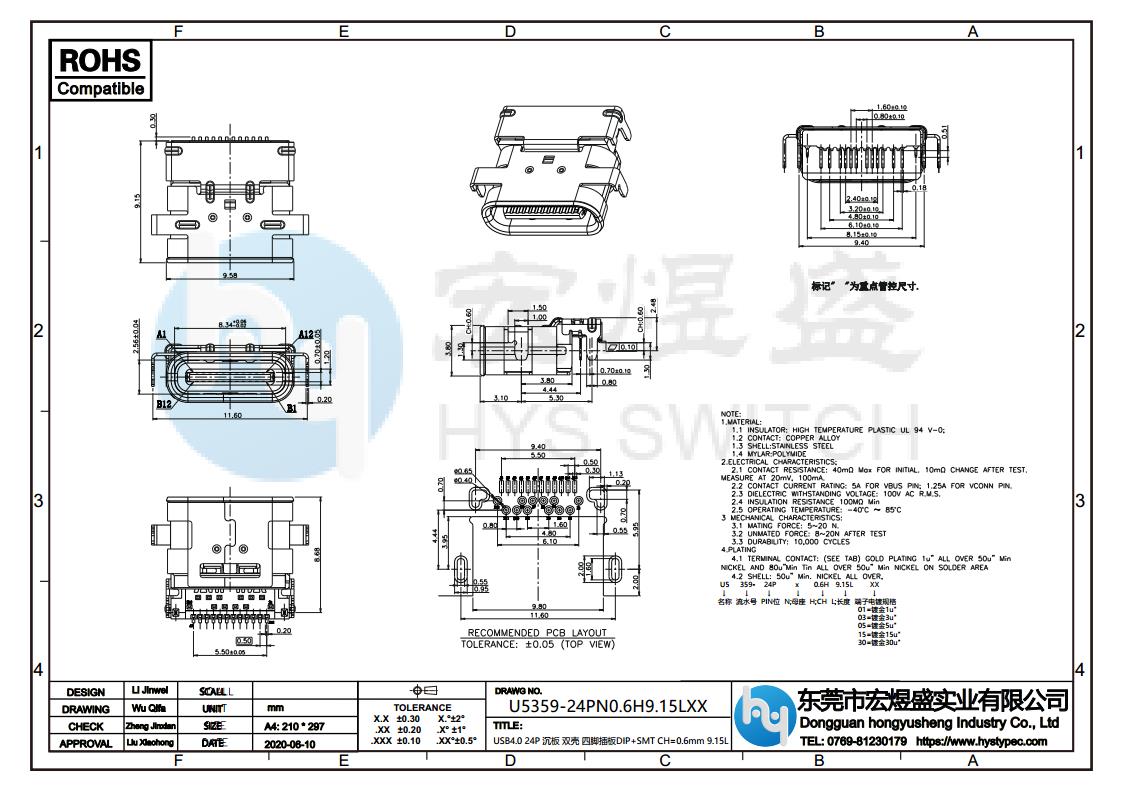 Type-C USB4.0母座24P 沉板 双壳 四脚插板DIP+SMT CH=0.6mm 9.15L